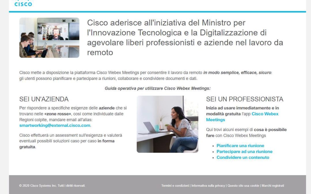 Sicab sente il dovere di aiutare i propri clienti ad affrontare la situazione, insieme a Cisco vi offriamo la possibilità di implementare velocemente una piattaforma che permette la condivisione dei contenuti e l’implementazione di riunioni da remoto con colleghi, clienti e fornitori. Oltre a renderla immediatamente operativa vi forniremo tutto il supporto iniziale per usarla efficientemente e mantenere la vostra produttività aziendale.